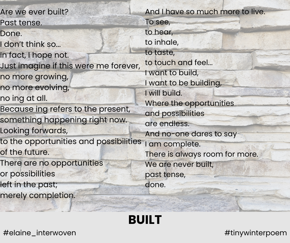 It’s the end of the winter in Europe, and I accepted the challenge from the English writer Beth Kempton to join in with #tinywinterpoem. One poem a day for the last week of winter, with a one word prompt from the Beth and ten minutes to capture words with no editing. The invitation was then to share, which feels a much bigger challenge. I love writing, and I love sharing my blog because I’m not sure that there are that many people who have found me, and so it feels very safe! So, let’s begin here, and from here perhaps the next step will be to share them each on my social media pages, with the next step being to tag @bethkempton…